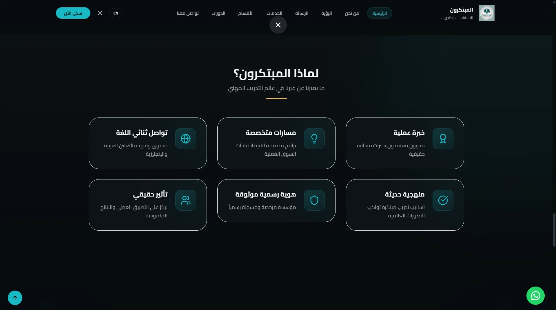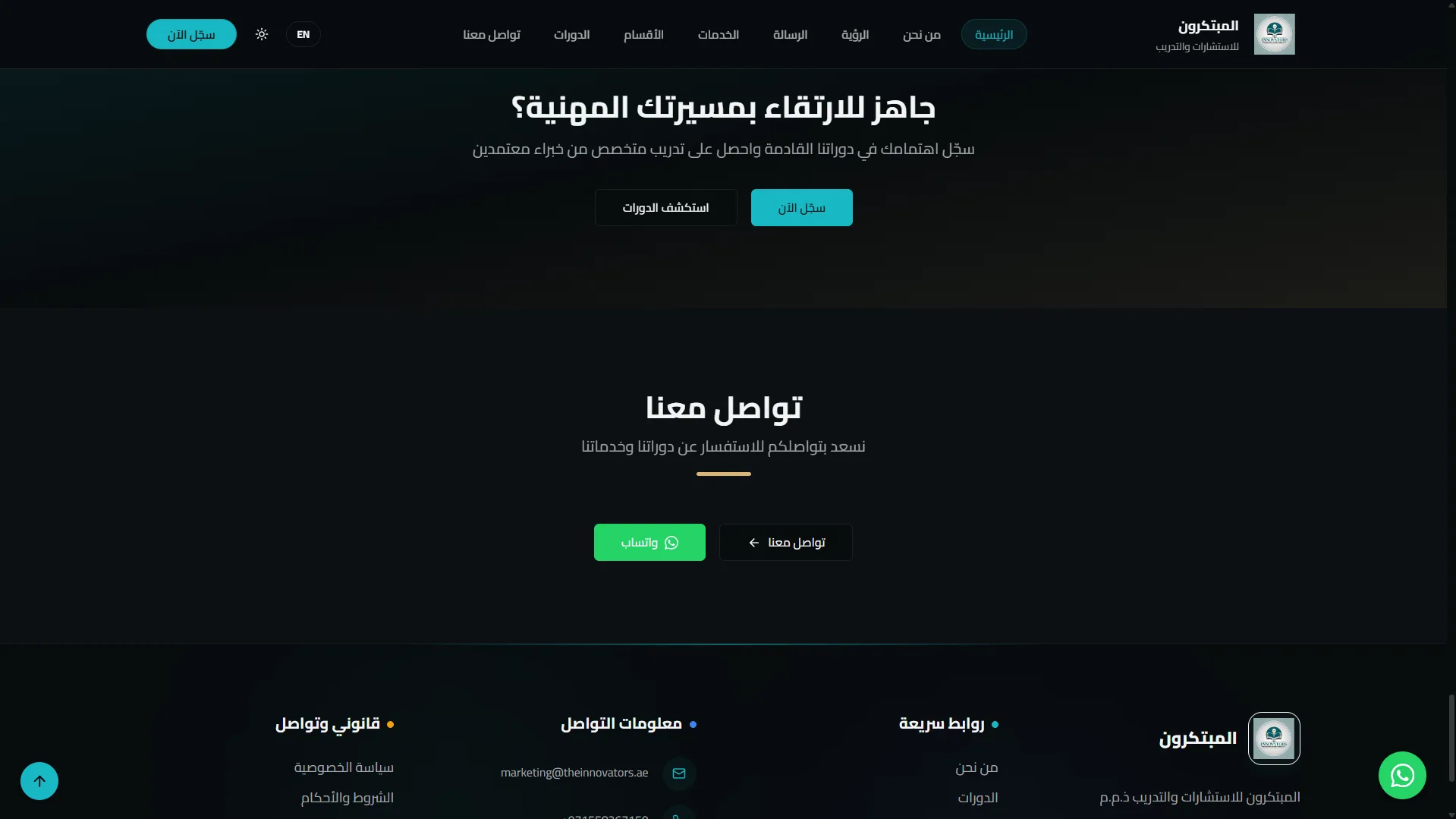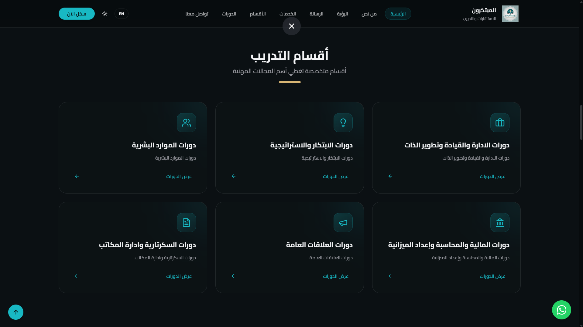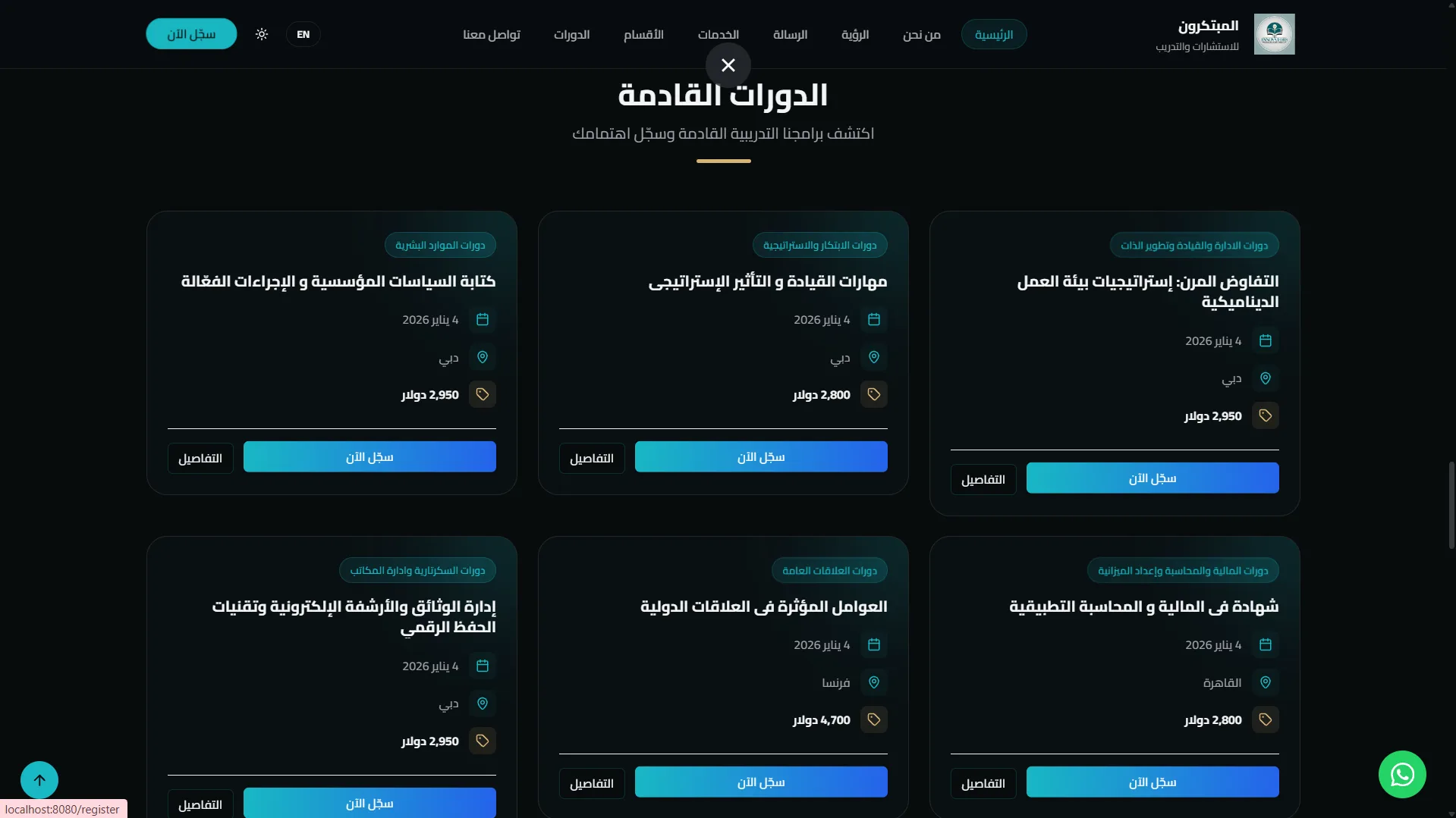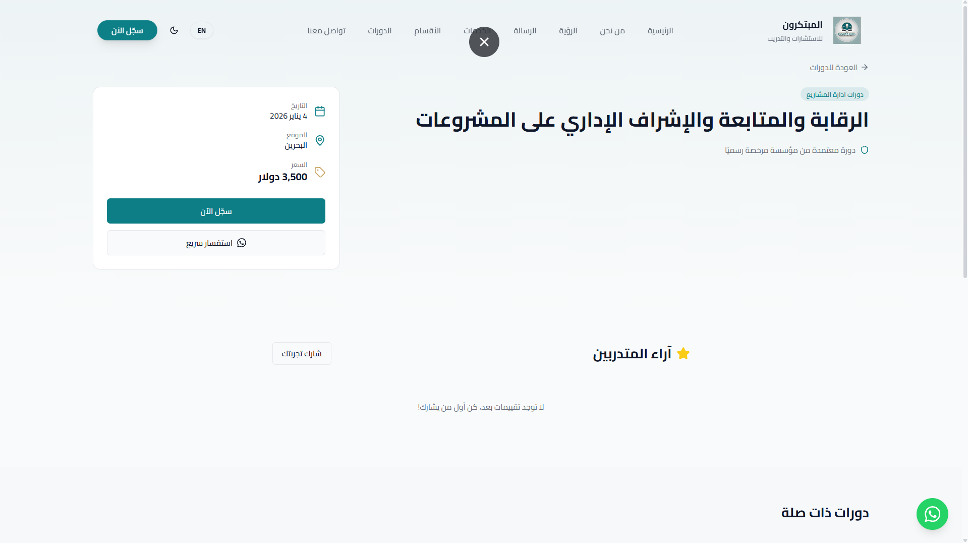 مشروع "المبتكرون" هو موقع ويب احترافي مصمم لعرض الدورات التدريبية وإدارة تسجيل المستخدمين بطريقة سهلة وجذابة.