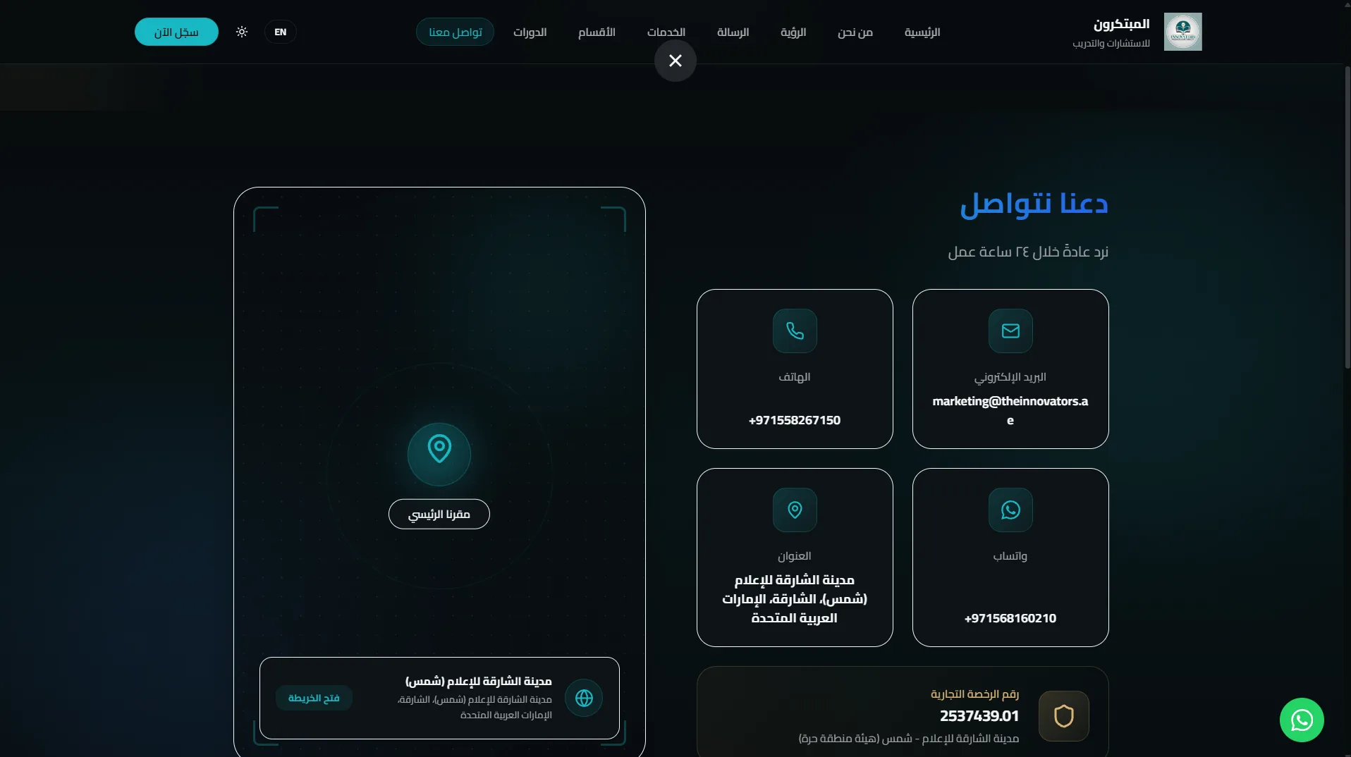 ✅ قسم تواصل متكامل (واتساب + بيانات كاملة)