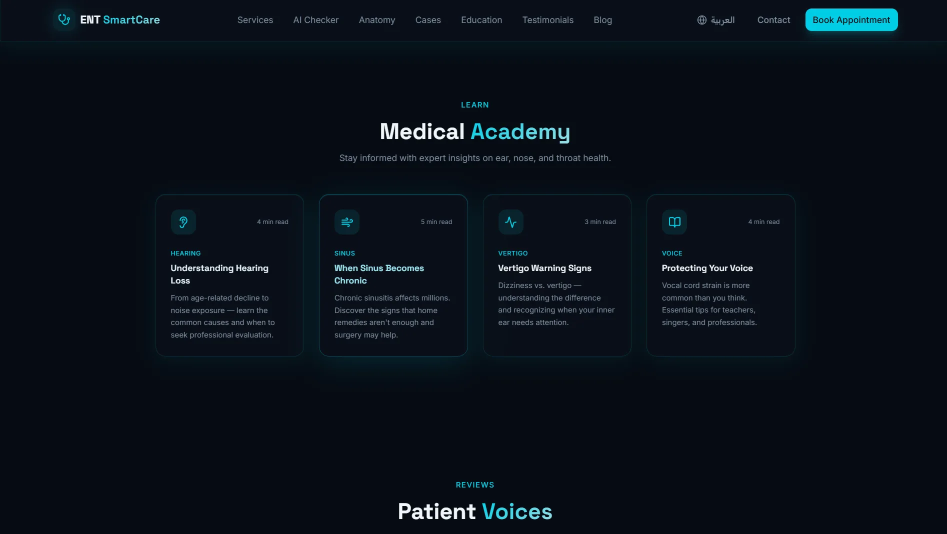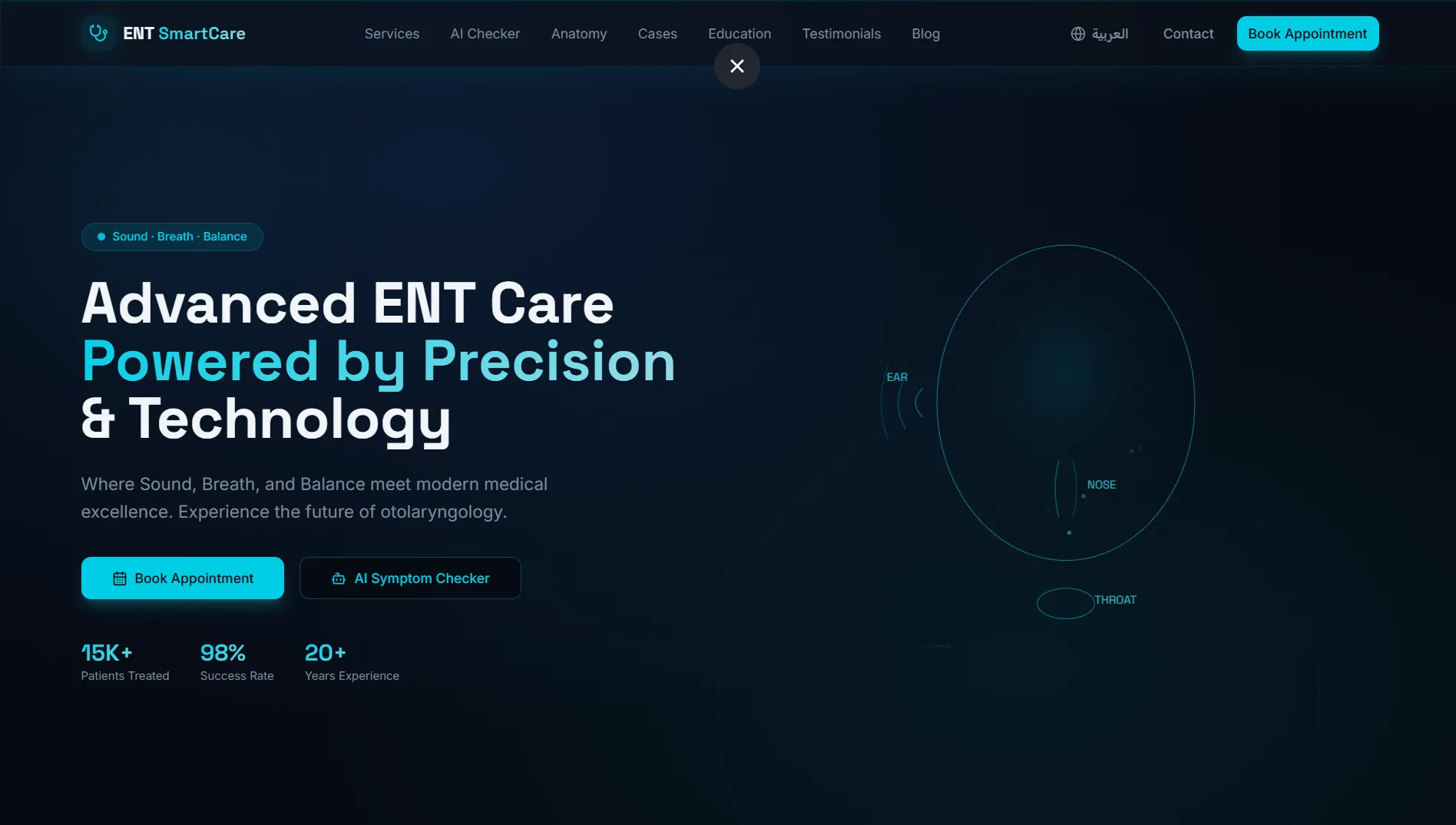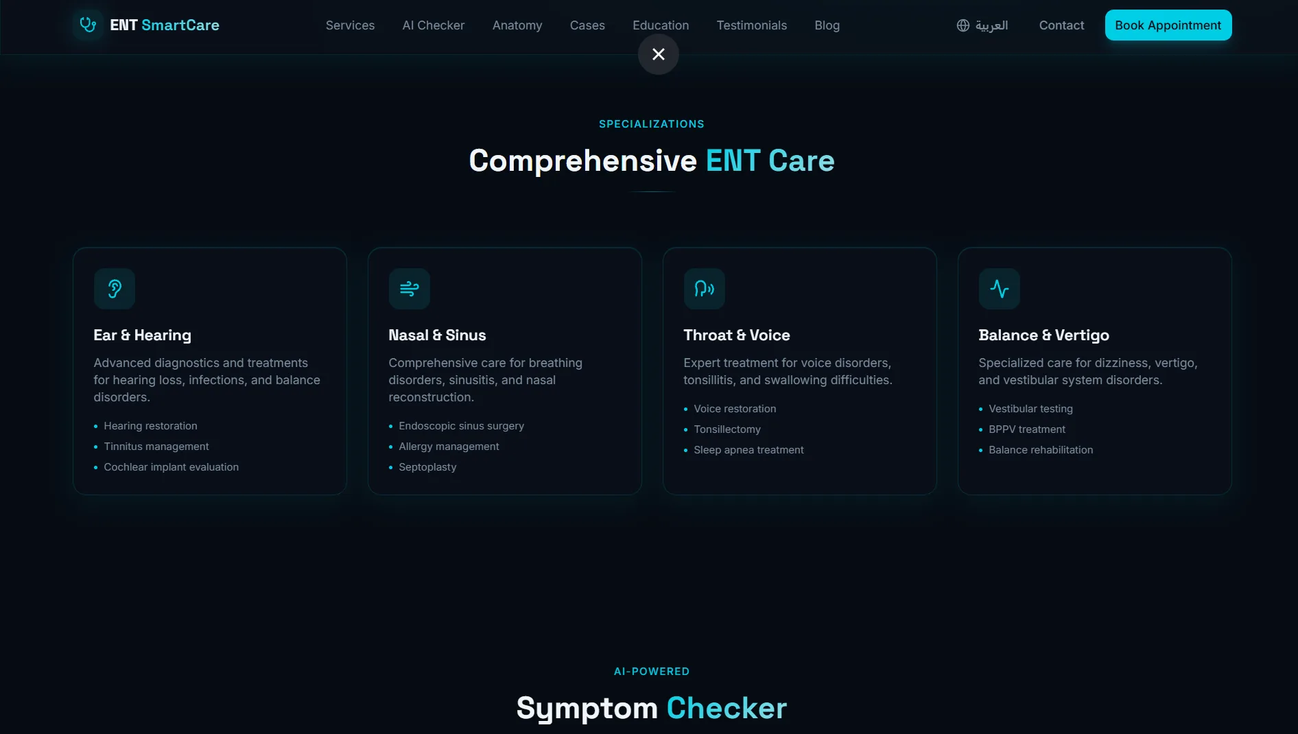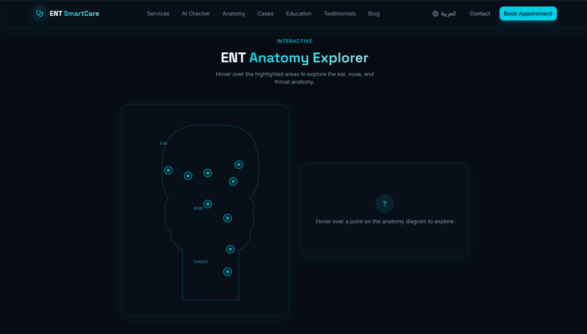 موقع عيادة متخصصة في أمراض الأنف والأذن والحنجرة — تصميم تقني داكن بلمسة سيانية آسرة، يجمع بين الذكاء الاصطناعي وأدوات تفاعلية تعليمية لتجربة مريض استثنائية.