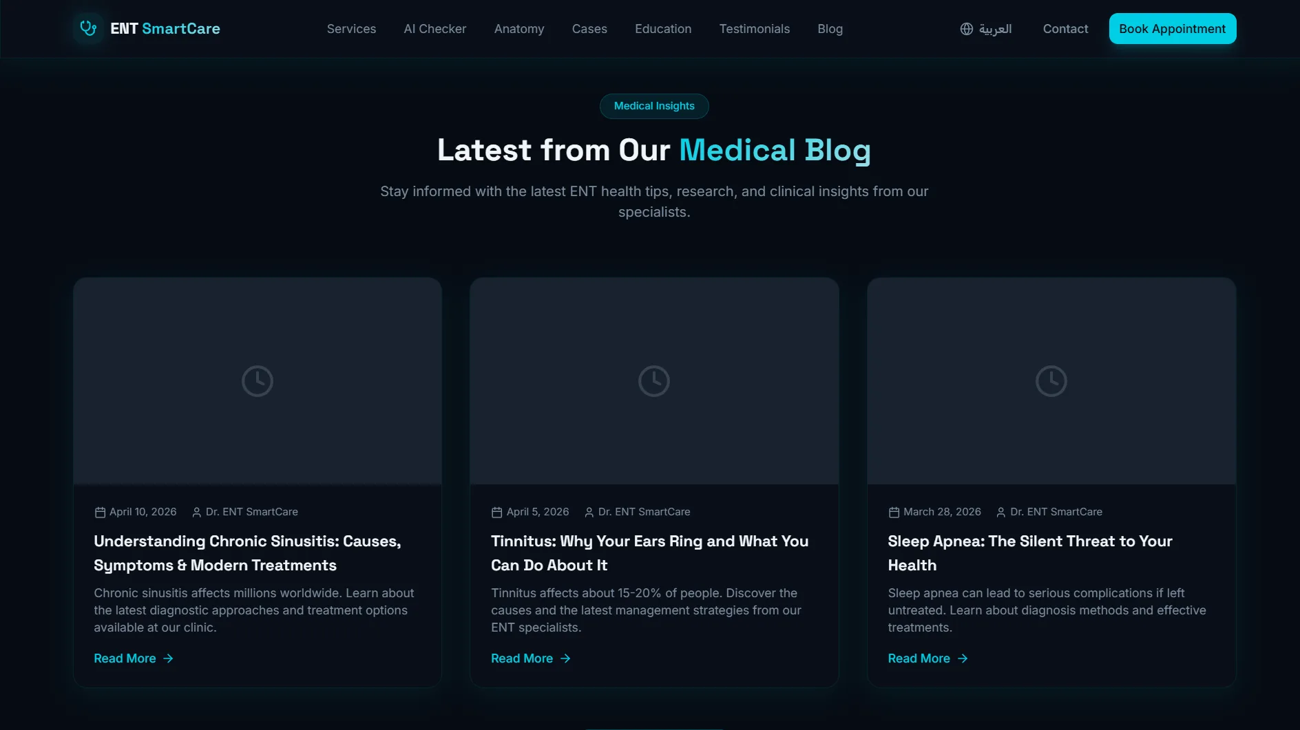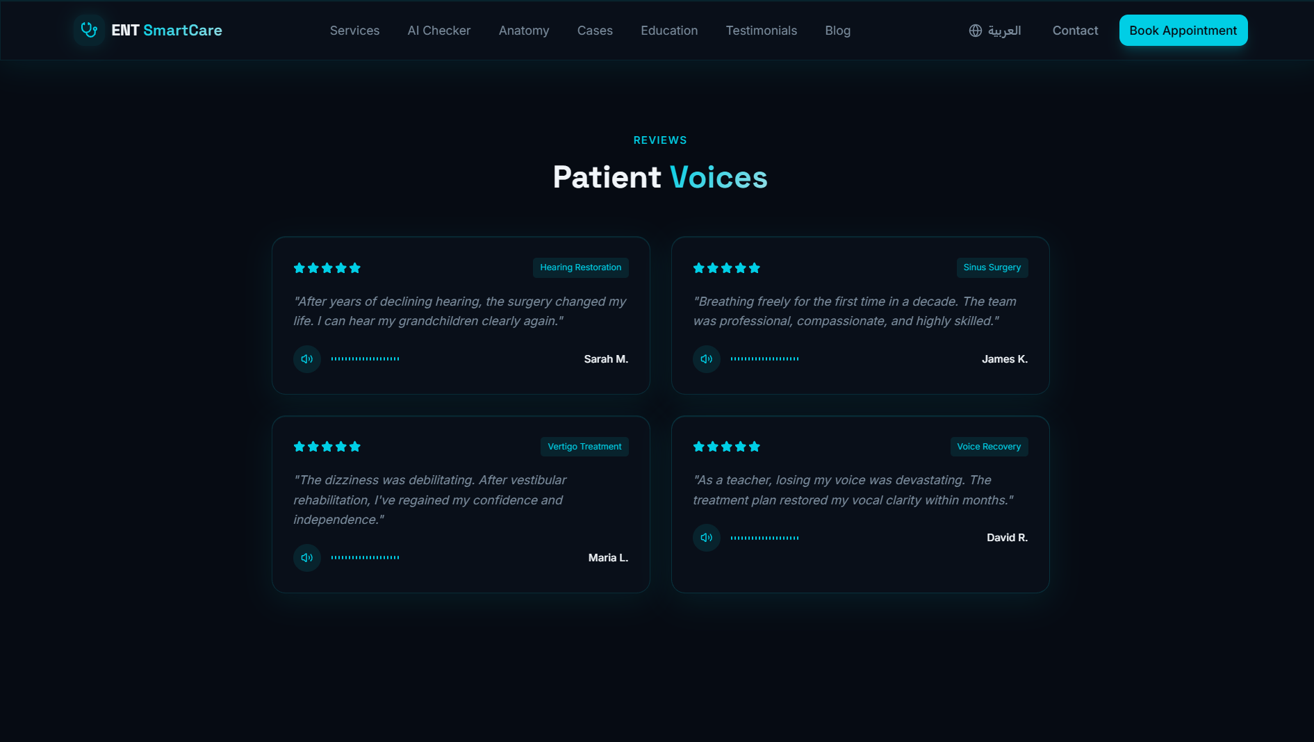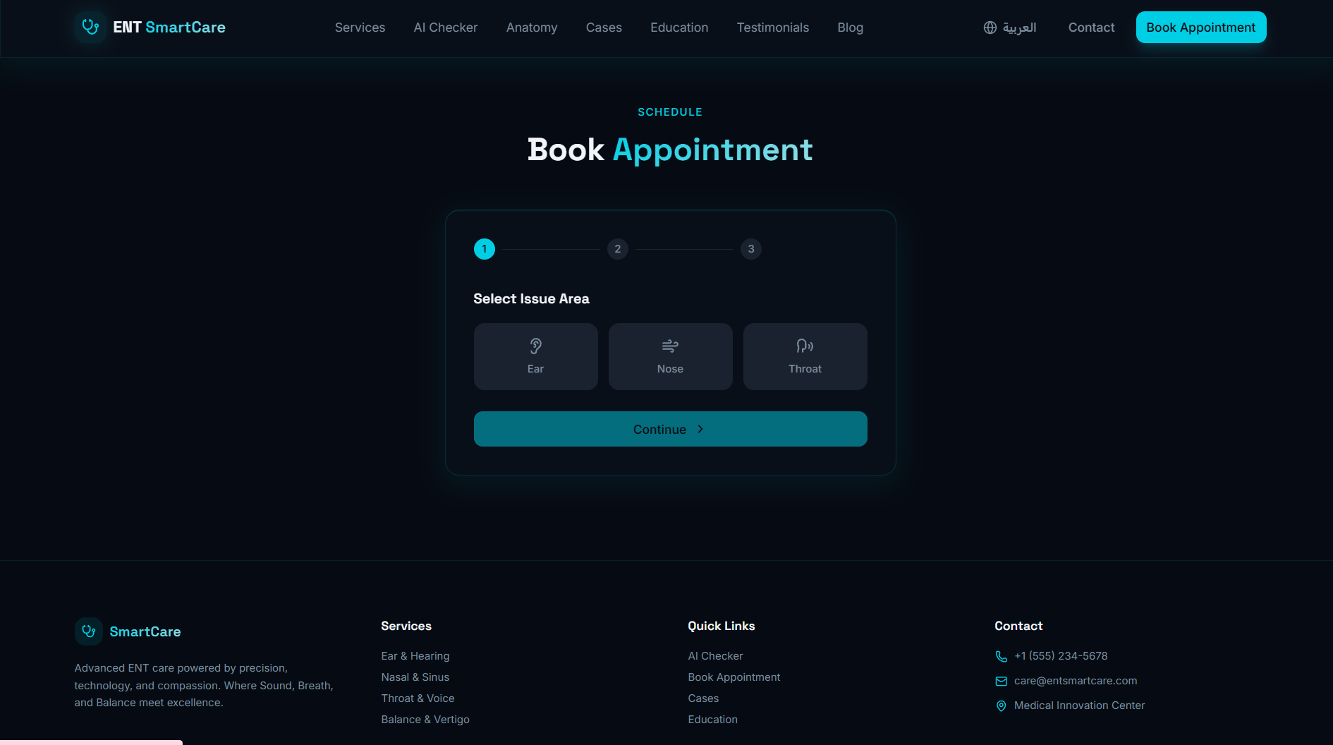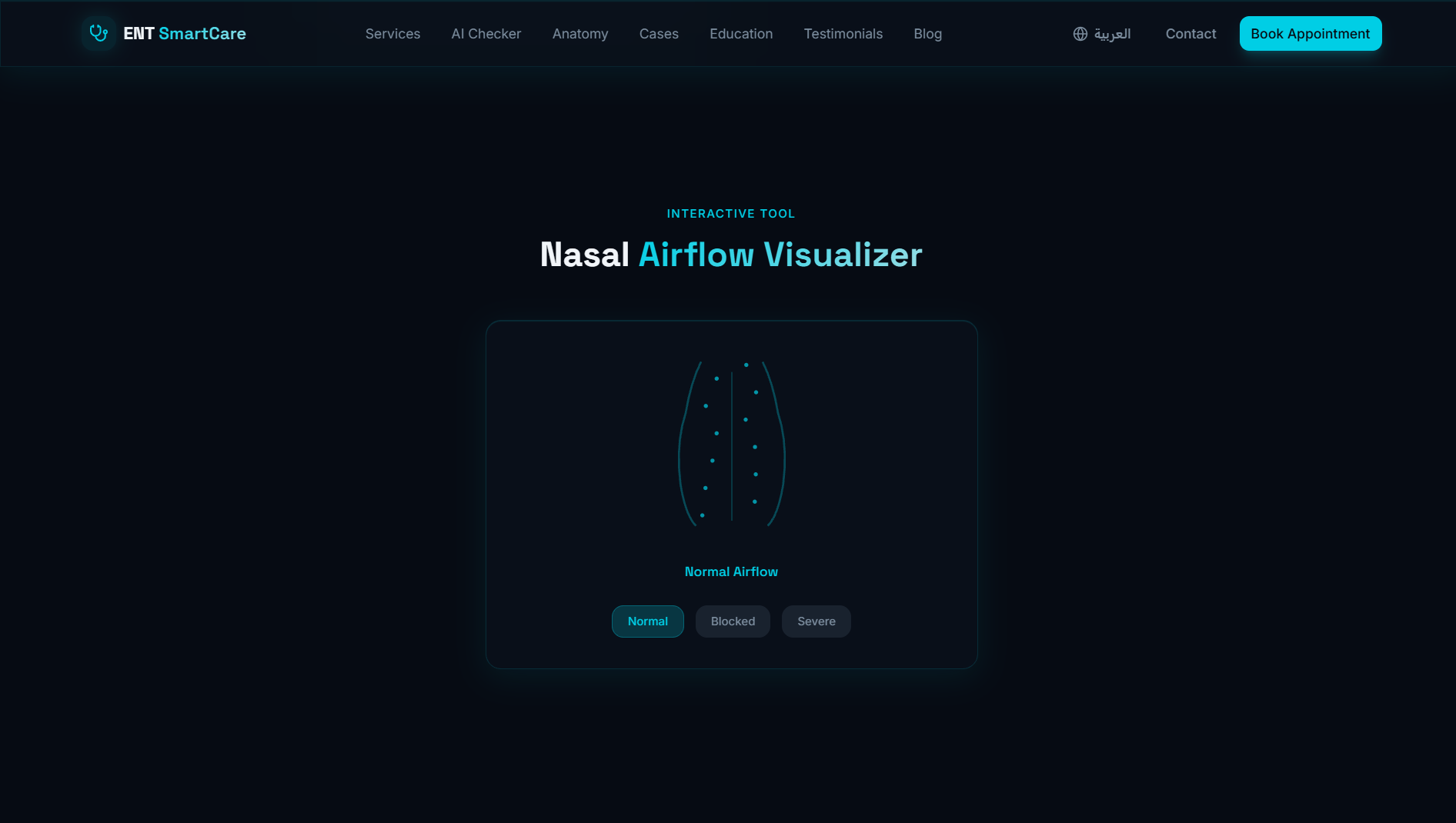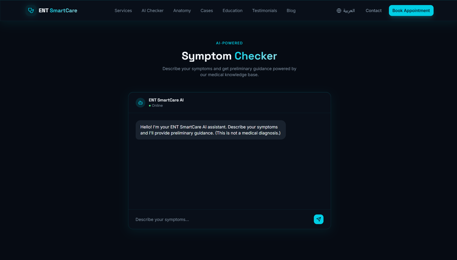 موقع عيادة متخصصة في أمراض الأنف والأذن والحنجرة — تصميم تقني داكن بلمسة سيانية آسرة، يجمع بين الذكاء الاصطناعي وأدوات تفاعلية تعليمية لتجربة مريض استثنائية.